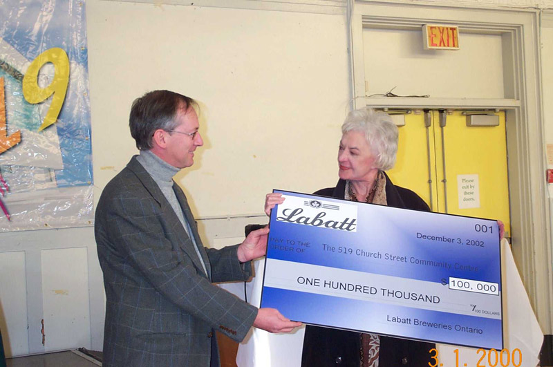 Bea Arthur hosts an event and accepts ceremonial cheques for The 519’s capital campaign from Labatt Breweries and Rogers Communications.