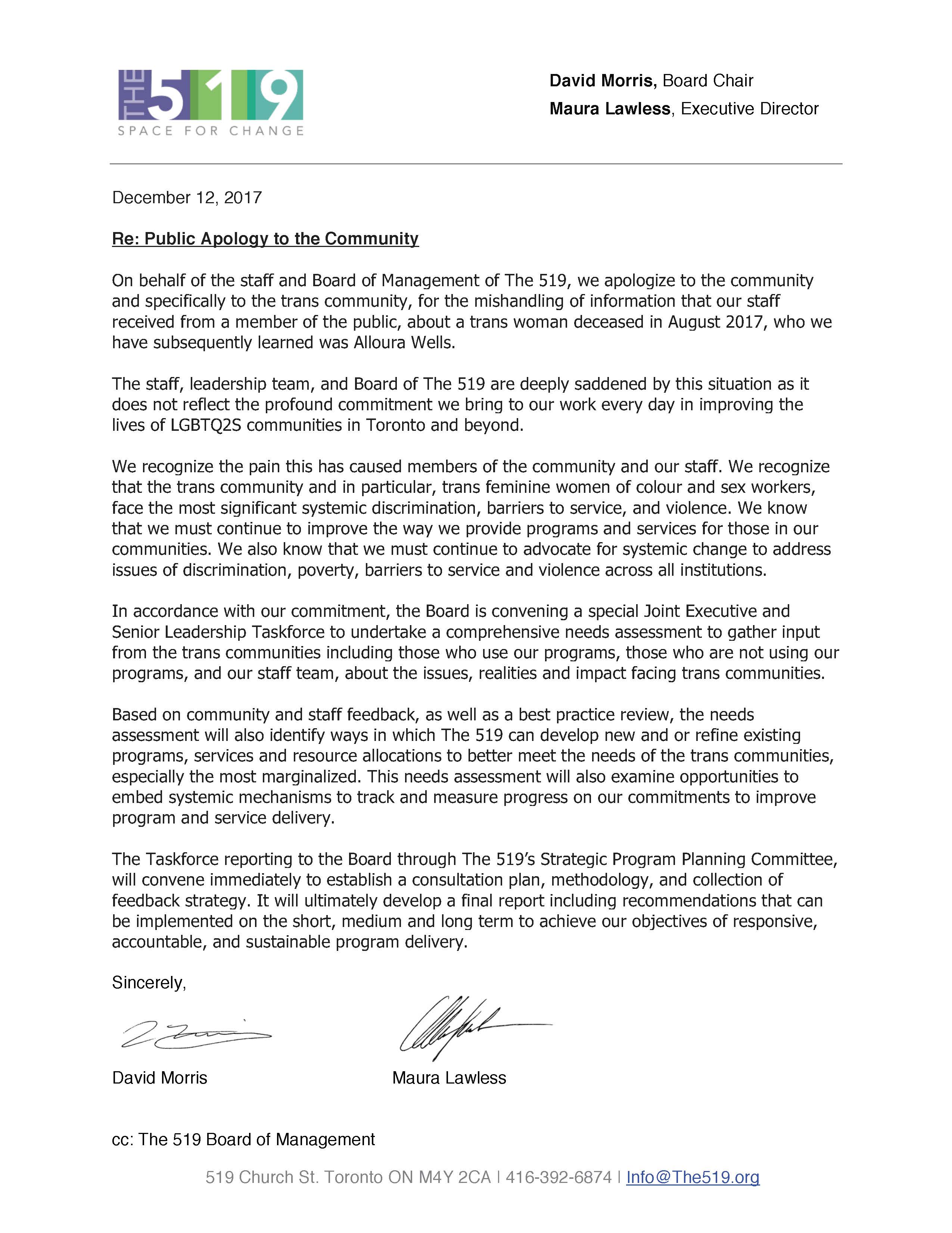 On behalf of the staff and Board of Management of The 519, we apologize to the community and specifically to the trans community, for the mishandling of information that our staff received from a member of the public, about a trans woman deceased in August 2017, who we have subsequently learned was Alloura Wells.