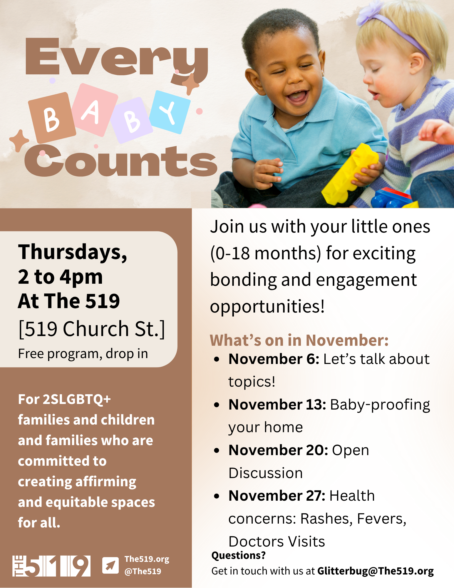 Every Baby Counts (EBC) is a free, drop-in blended The 519 community-led group for parents and caregivers of children ages 0 to 18 months. EBC is a safe space that prioritizes 2SLGBTQ+, as well as BIPOC (Black, Indigenous, People of Color) families and allies that provides inclusive and affirming supports for all diverse infants and their families.