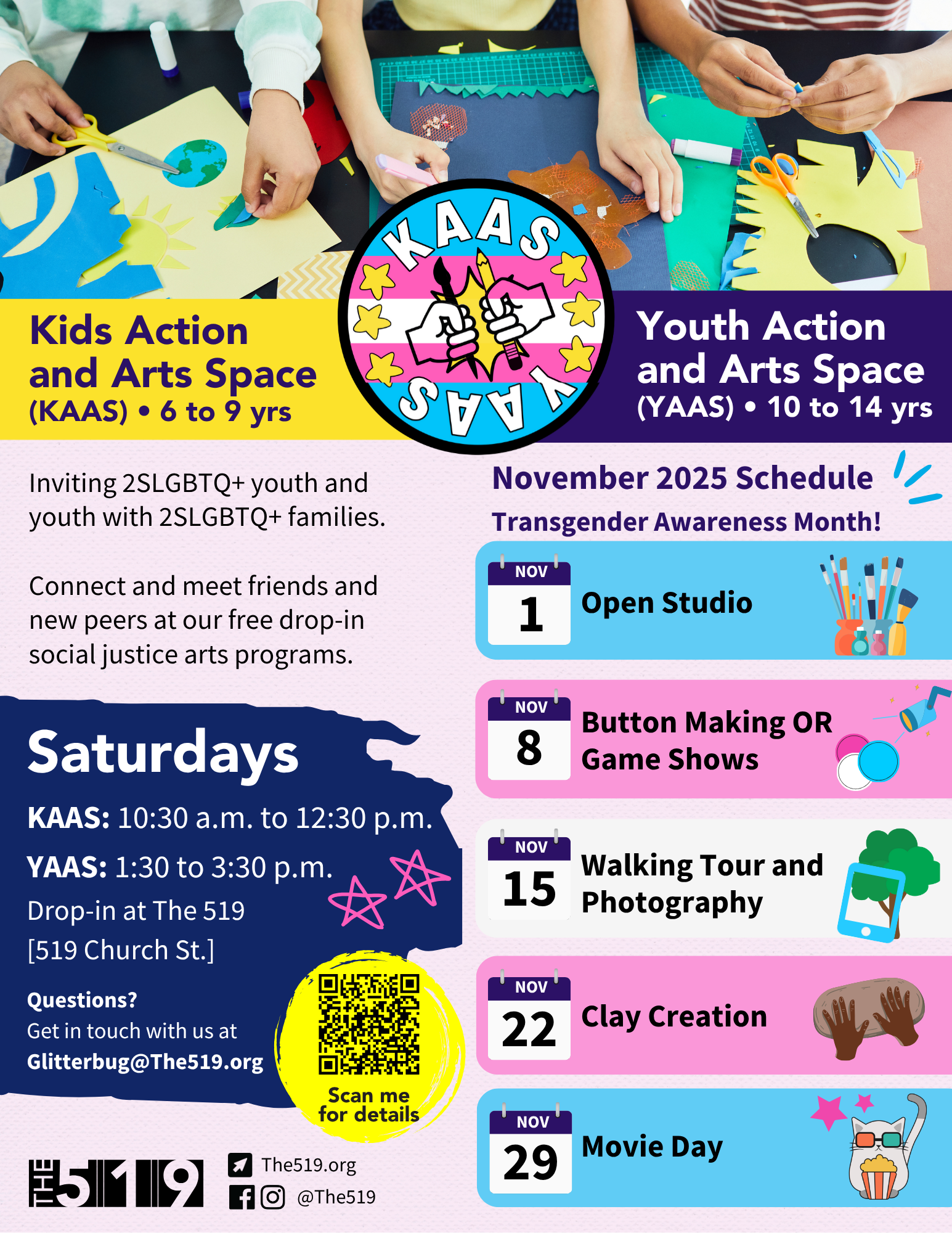 The 519’s Kids Action and Arts Space (KAAS) is a free, drop-in program that offers youth who are 6 to 9 years old a fun place to connect, meet friends and new peers.