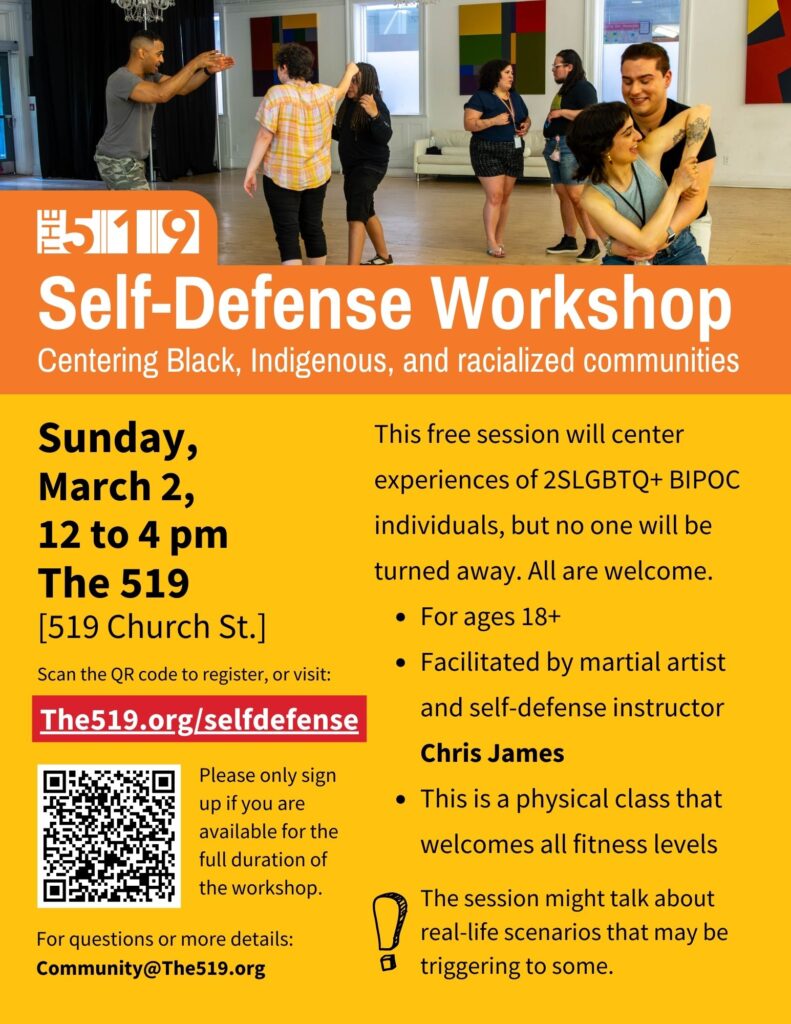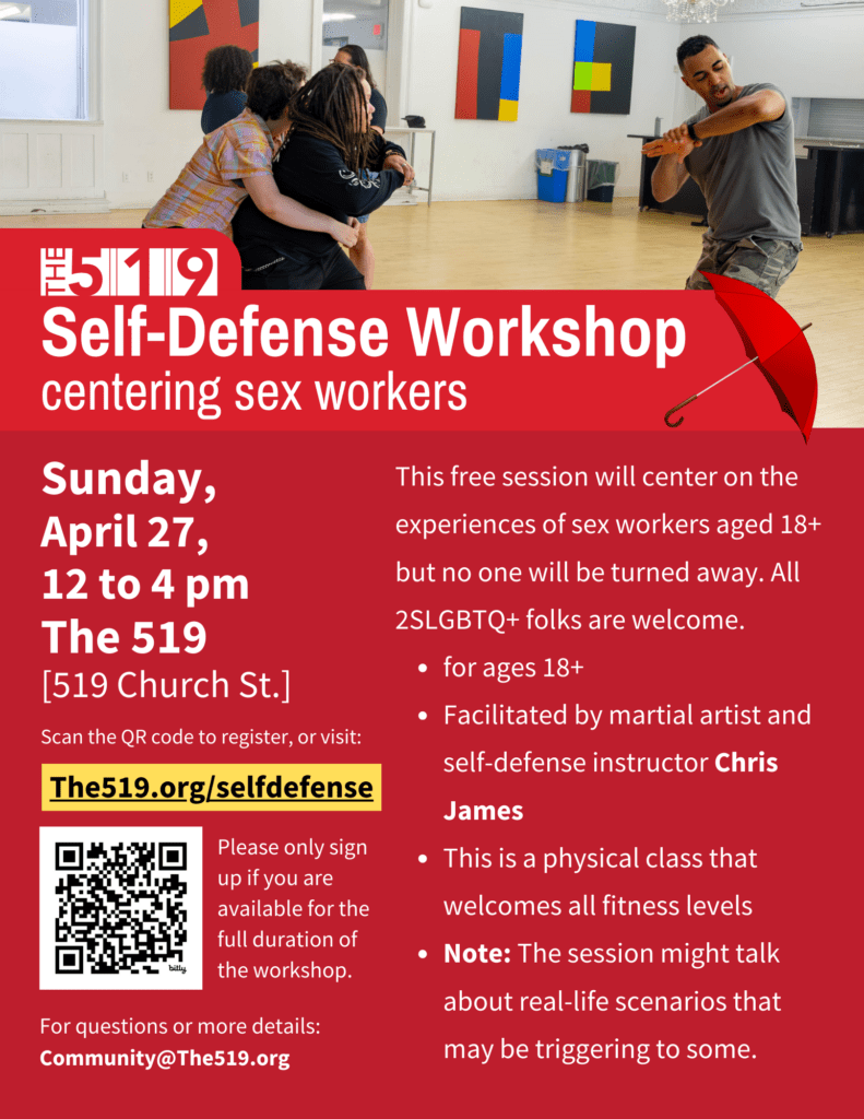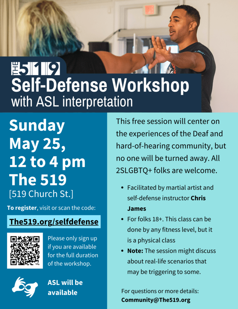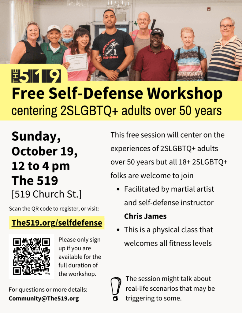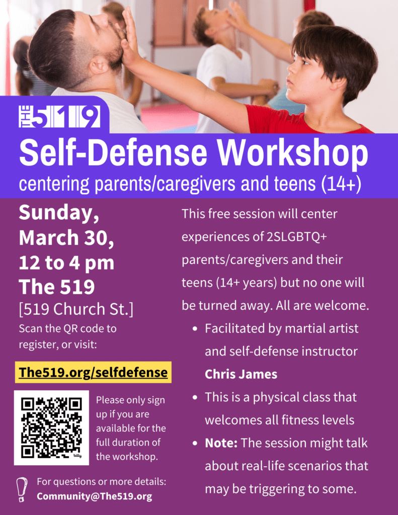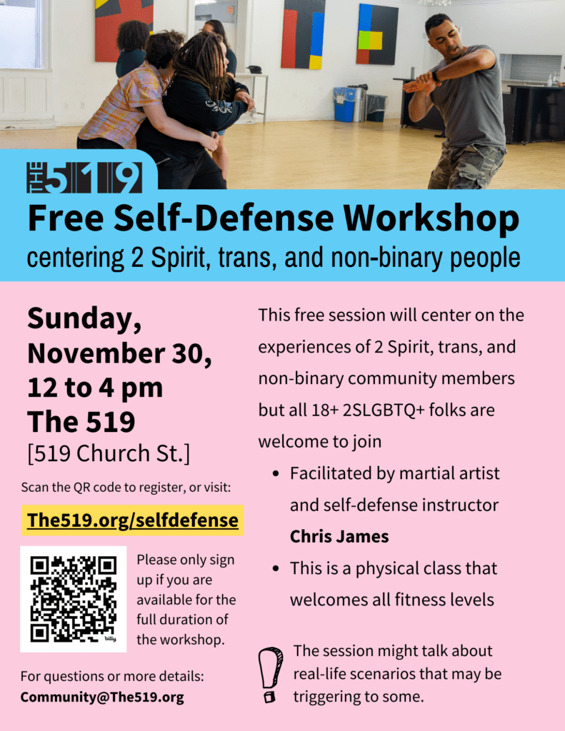 About the facilitator: Chris James has been emersed in martial arts and volunteering for the last 10+ years, and merged these two passions together 5+ years ago when he started his charity initiative to share his knowledge of self-defense to his community. Along with his incredible volunteers, he has taught self-defense all over the GTA as well as internationally. Chris is thrilled to be partnering with The 519 to expand this initiative and help keep his community safe and secure.