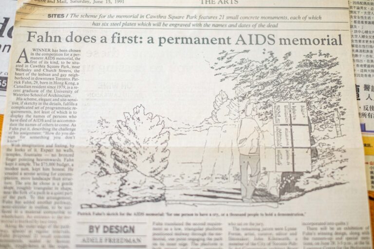 People started losing loved ones to AIDS in the 1980s. The experience was isolating and devoid of dignity. On Lesbian and Gay Pride Day every year, a group of 2SLGBTQ+ folks led by Michael Lynch began installing a makeshift memorial on the south side of The 519 to honour their loved ones. They knew they eventually needed a permanent memorial, so they organized and called for proposals in the then-quarterly Xtra Magazine. Patrick was among those who responded.